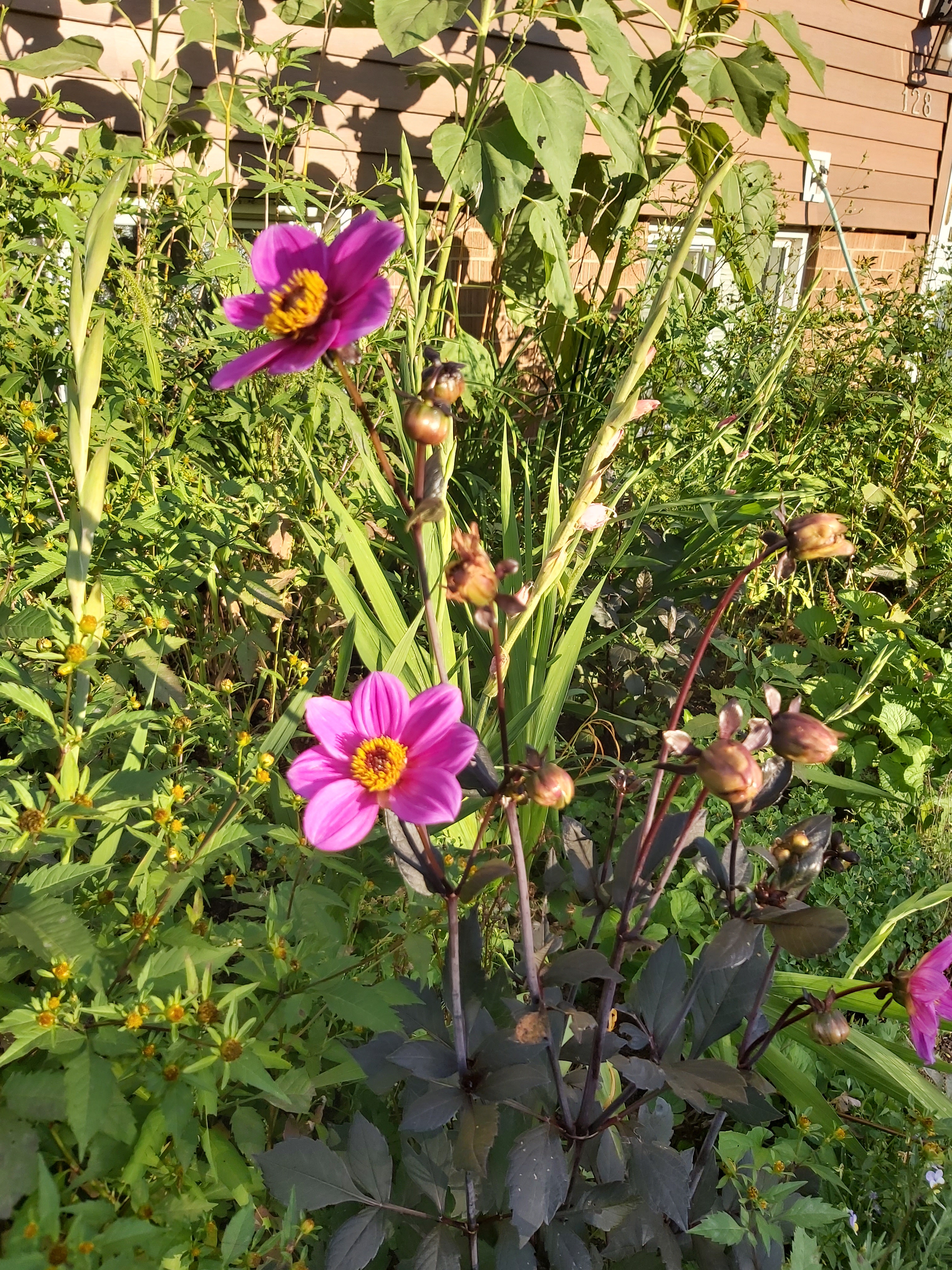 Gladiolus. I find the palate of these flowers stunning. Each scape has 11 or 12 flowers which make them a tower of beautiful bee food.